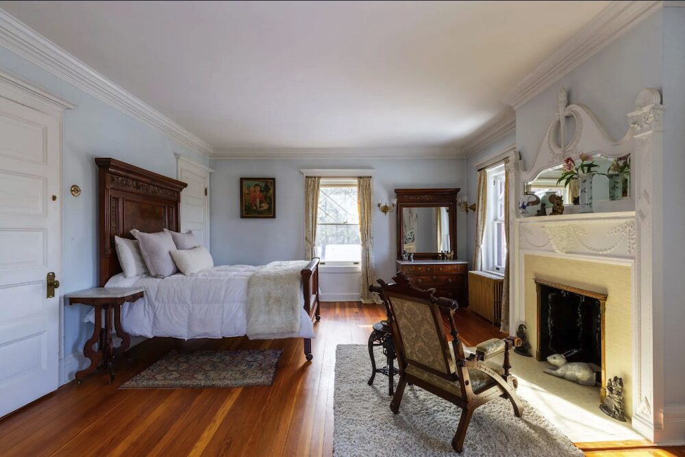 The tower’s second floor reveals a light-filled office, where three tall windows, still draped in the original curtains personally selected by the Coykendalls, frame views that have inspired imagination for more than 130 years. It is a space that feels both storied and inspired, equally suited for creative work or quiet reflection.